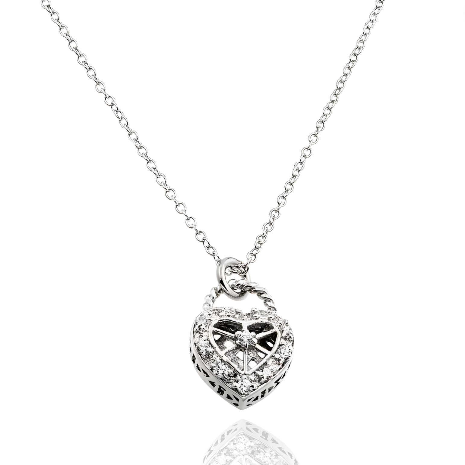 A heart, reimagined. The Cora Necklace features a pierced sterling silver pendant casting shadows of light through a filigree web of CZ. Suspended on a fine chain, it’s equal parts delicate and defiant.